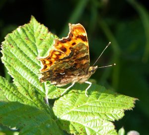 The Comma is a really vivid orange on top but darker brown underneath when it closes its wings. It has jagged edges to its wings and if you look carefully at the photo you can see the little white mark on the underside of its wing which is what gives it its name. It also loves bramble flowers.