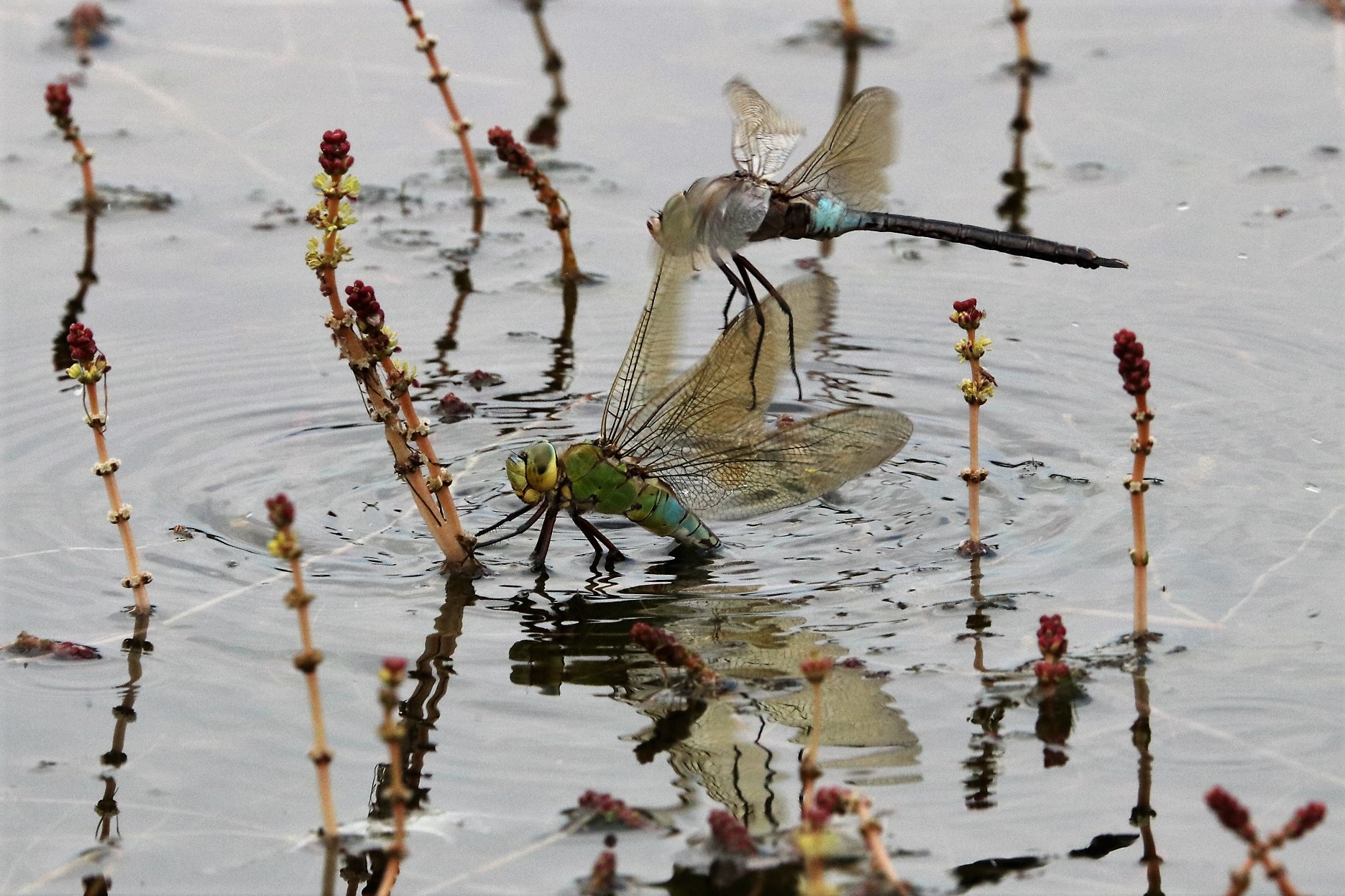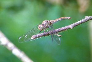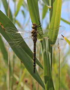 The dragonflies are much larger and faster flying and can be very colourful. Two species you are quite likely to see along the ryhnes and ditches in June are the Four-spot Chaser and the Emperor Dragonfly.
