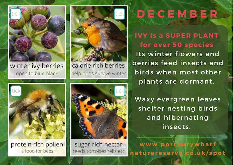 December is the month of CHRISTMAS and that makes it hard to avoid references to mistletoe, robins, holly and ivy! Let’s learn more about these Christmas symbols which you might spot on a walk around the reserve at this festive time of year.