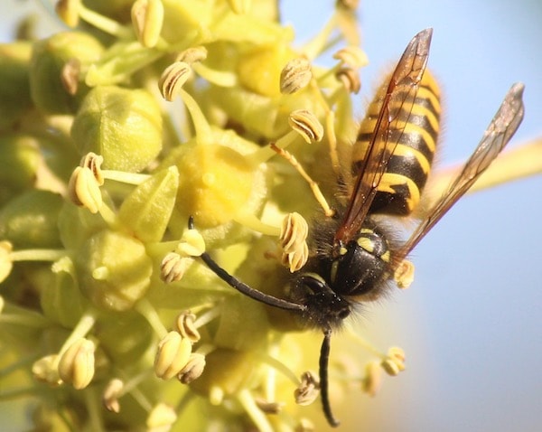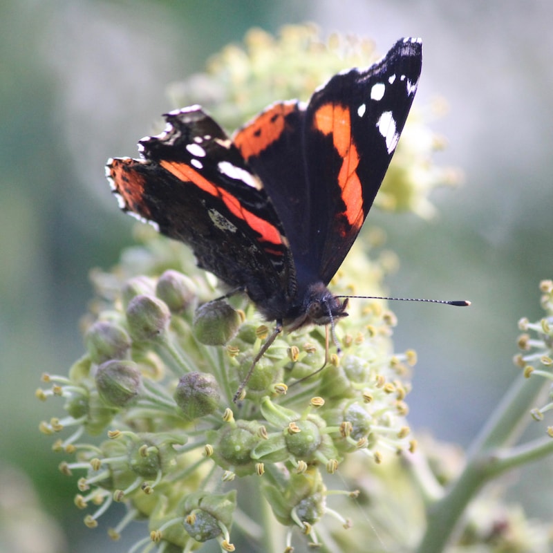 Ivy flowers from September to November. Butterflies, bees, wasps, hornets and many others come to feed on the nectar-rich flowers. So popular are the flowers that in late summer you can hear a heavily flowering ivy bush, it buzzes! It buzzes to the tune of hundreds of bees flying from flower to flower.