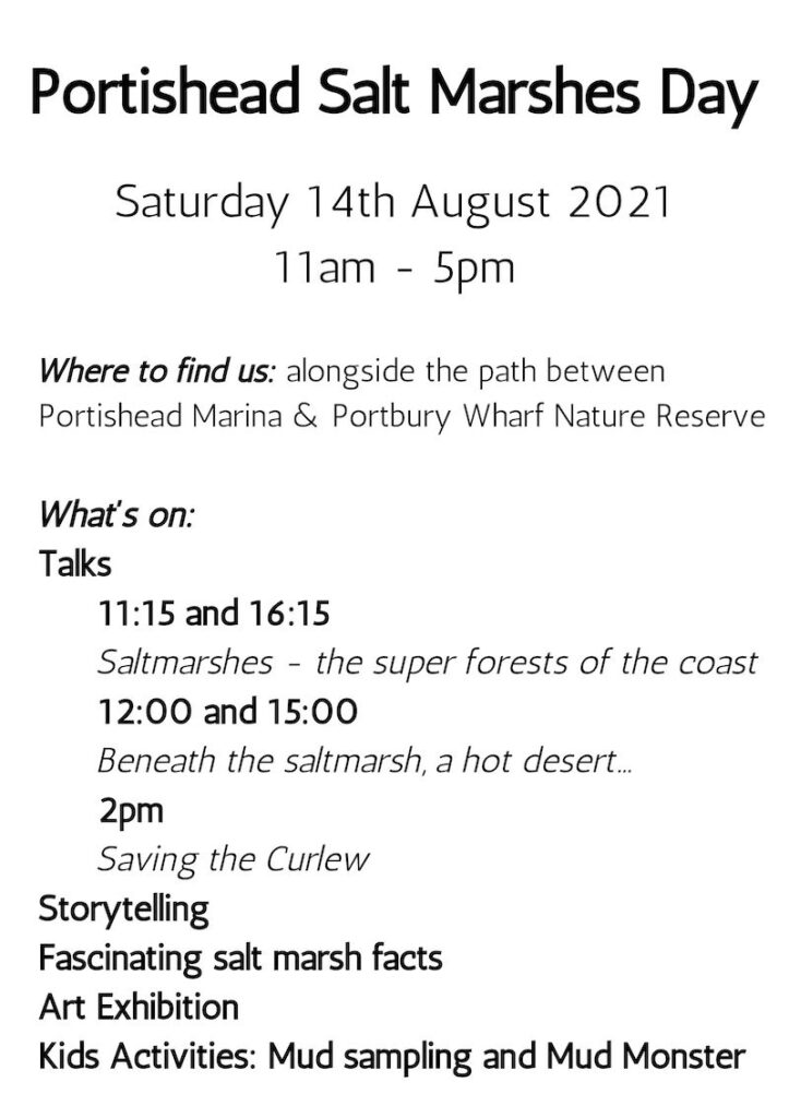 The 2022 event is on Saturday 13th August 2021 Portishead Salt Marshes Day is on Saturday August 14th. It is a celebration of our salt marshes. We have two salt marshes locally, one by the Lake Grounds at Battery Point and the other at Portbury Wharf. They are designated Sites of Special Scientific Interest (SSSI) because they are such important conservation areas. Home to increasingly threatened species, such as the curlew, they are surprisingly biodiverse and bio-abundant. They are also extremely valuable carbon sinks that help combat global warming.